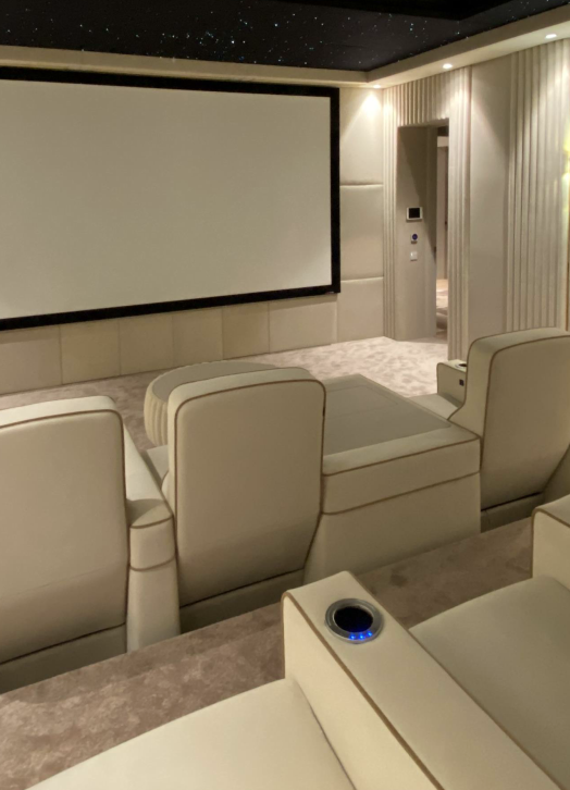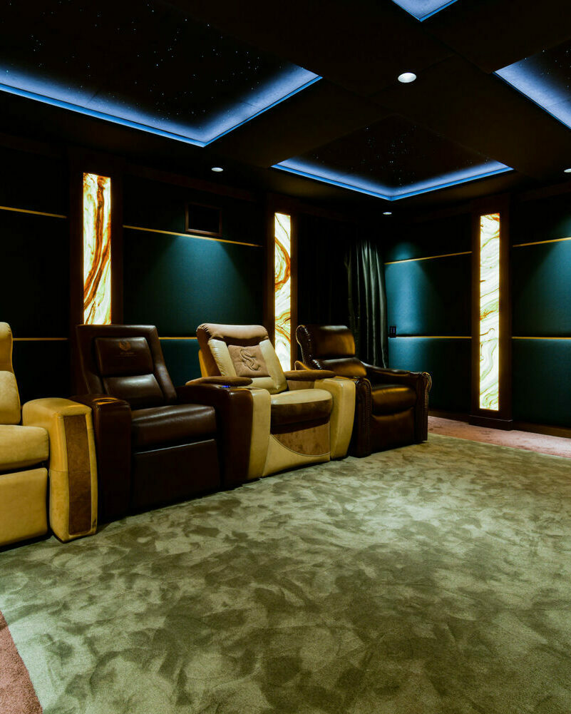 Уникальный персональный кинозал с системой двойной проекции (единственный в мире на данный момент). Формат звука Dolby Atmos 11.2.4. Голосовое управление посредством Siri, а также сценарное управление через iPad и дополнительный пульт RTI. При переключении с основного экрана на моторизованный потолочный происходит автоматическая перестройка акустической системы, что позволяет полностью поменять звуковую картину (даже в лежачем положении зритель получает все эффекты с правильных сторон). Моторизованная мебель специально разработана для этого проекта и оснащена подстаканниками с сенсорным управлением, подсветкой и охлаждением, во втором ряду расположен интегрированный бар. На потолке расположилась модульная система звёздного неба, созданная по астрономическим картам, что позволило создать потрясающую атмосферу в зале.